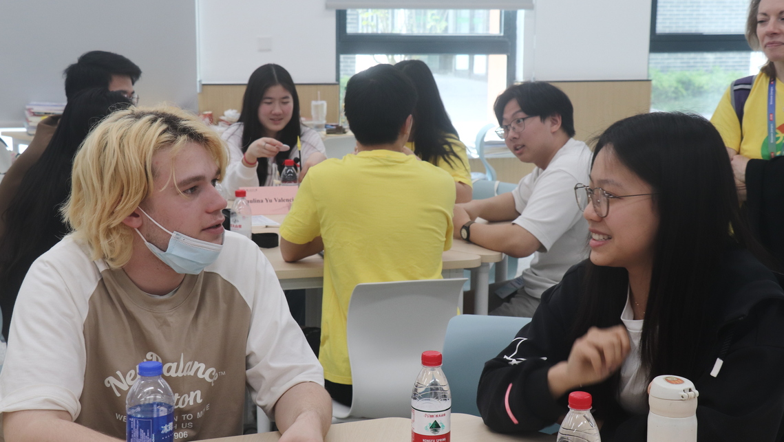 活动现场,中美学生分组围坐,展开“头脑风暴”。美国学生分享中文学习趣事引发阵阵欢笑,中国同学则系统讲解“从农田到餐桌”的全链条食品安全监管体系。当讨论延展至社交媒体、影视音乐等生活话题时,现场气氛愈发热烈。中午时分,交流活动“移师”学生食堂,在麻婆豆腐的麻辣鲜香与糖醋排骨的酸甜酥脆中展开美食文化对话。中国学子如数家珍讲述菜品典故,美国学生举筷品尝频频点赞。“差异恰是合作创新的基石”,学生志愿者张飞宇在见证一位立志研究人类疾病学的美国高中生所展现出的超越年龄的人文关怀后感慨道。
