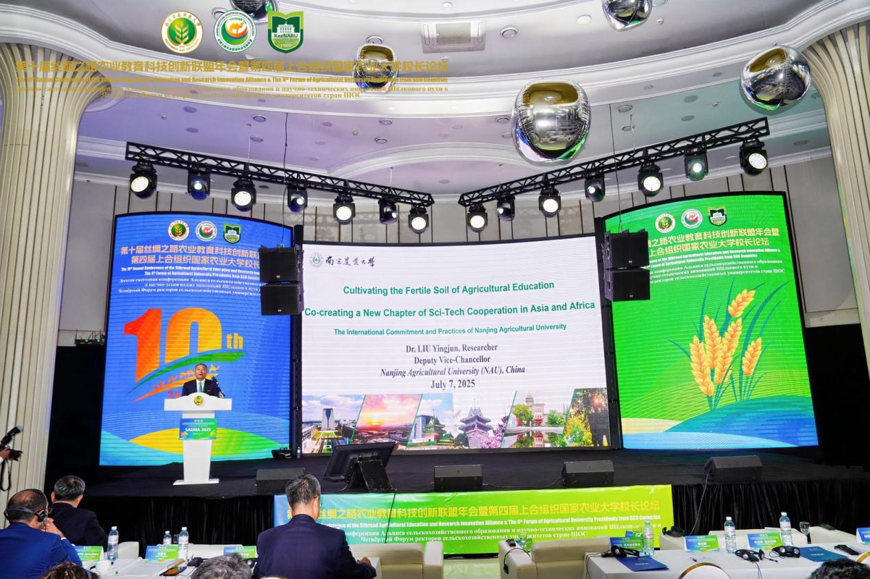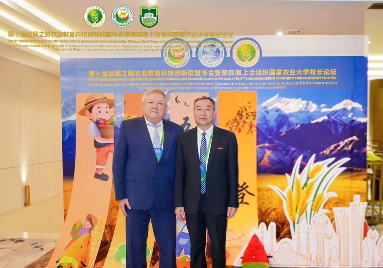 7月6日至8日,第十届丝绸之路农业教育科技创新联盟年会暨第四届上海合作组织国家农业大学校长论坛在阿拉木图市举办。作为联盟常任理事单位,刘营军代表学校出席年会并在校长论坛上作主旨报告。刘营军详细介绍了我校的历史沿革和发展现状,并重点介绍了学校在国际合作交流领域的实践成果,特别是与"一带一路"沿线的亚洲及非洲国家开展的教育科研合作情况。