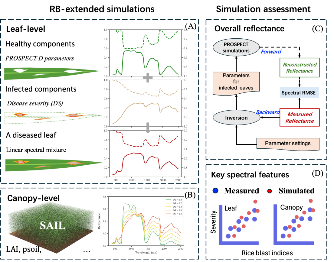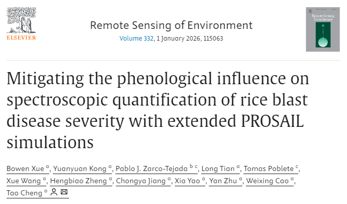 近日,农学院智慧农业创新团队联合澳大利亚墨尔本大学(The University of Melbourne)团队在国际顶级遥感期刊Remote Sensing of Environment发表了题为“Mitigating the phenological influence on spectroscopic quantification of rice blast disease severity with extended PROSAIL simulations”的研究论文,报道了团队在稻瘟病严重度光谱监测机理与方法方面的重要进展。