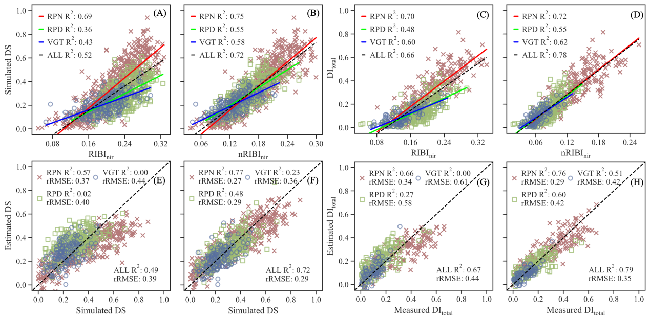 图2 稻瘟病指数归一化前(RIBInir)后(nRIBInir)在模拟(A-B、E-F)和实测数据集(C-D、G-H)中的病情估算效果