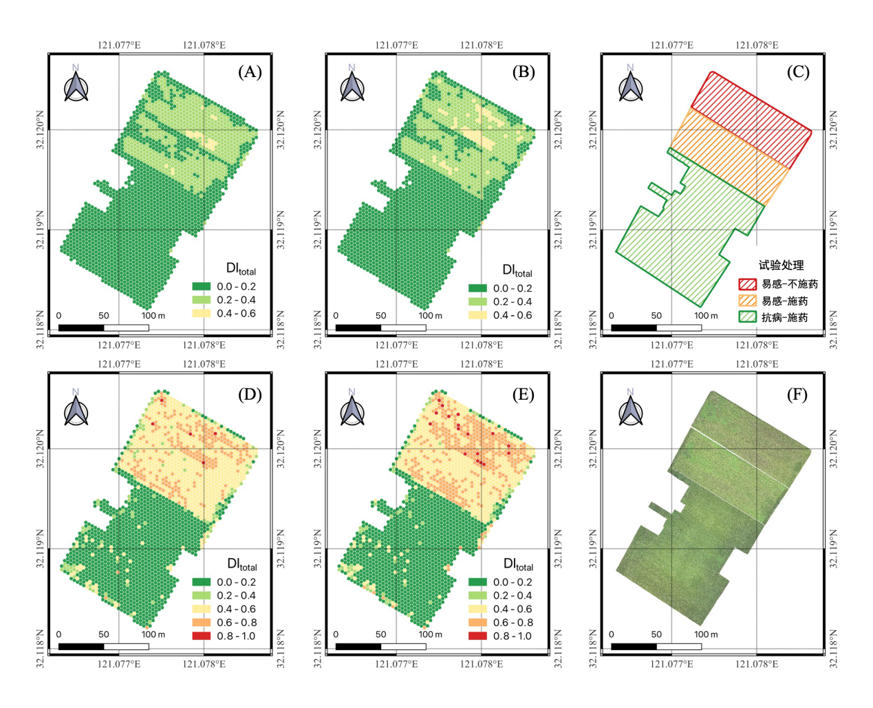 图3 稻瘟病指数归一化前(A、D)后(B、E)的病情制图结果对比,(C、F)分别为研究区的试验处理示意图和无人机正射影像