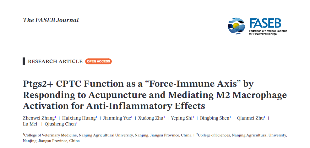 近日,ios版雷竞技官网动物医学院中医经络与针灸机制研究团队在Computational and Structural Biotechnology Journal期刊上发表了题为“Application of single-cell deep learning in elucidating the mapping relationship between visceral and body surface inflammatory patterns”的最新研究成果。与此同时,该团队在The FASEB Journal期刊上,发表了题为“Ptgs2+ CPTC Function as a 'Force-Immune Axis' by Responding to Acupuncture and Mediating M2 Macrophage Activation for Anti-Inflammatory Effects”的研究论文。科学阐释了古代经络的细胞实质,进一步开展中医药现代化的深度研究。