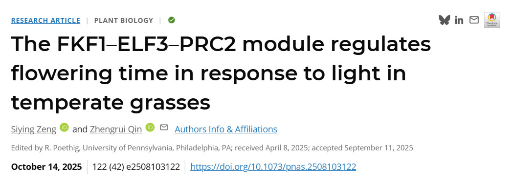 近日,ios版雷竞技官网草业学院秦正睿教授课题组在《美国科学院院刊》(PNAS)上发表了题为“The FKF1-ELF3-PRC2 module regulates flowering time in response to light in temperate grasses”的研究论文。该研究深入解析了光信号调控温带草类植物开花时间的分子机制及其表观遗传学基础,为今后培育高产、优质、广适的饲草品种奠定了重要理论基础。