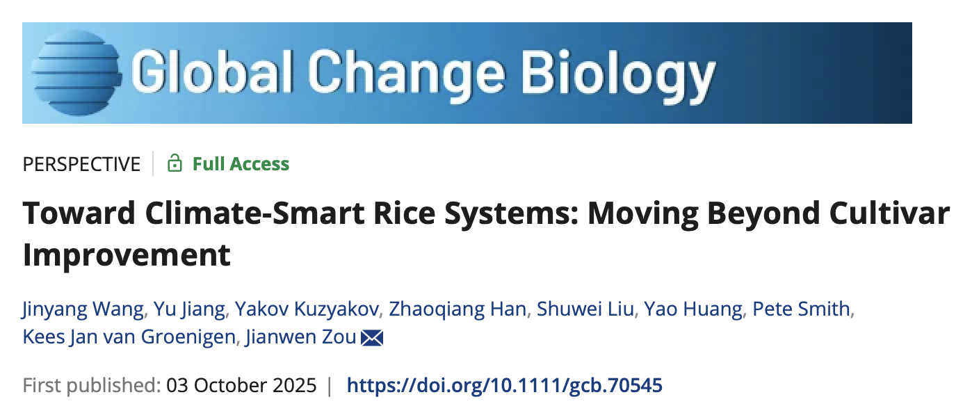 近日,ios版雷竞技官网邹建文教授团队在全球变化研究领域国际权威学术期刊《Global Change Biology》在线发表题为“Toward Climate-Smart Rice Systems: Moving Beyond Cultivar Improvement”的观点性文章。研究系统分析了当前水稻品种改良在甲烷减排与增产方面的局限,提出整合品种改良、水肥管理、根际微生物调控及抗逆育种的综合策略,为全球水稻产业绿色转型提供了新方向。