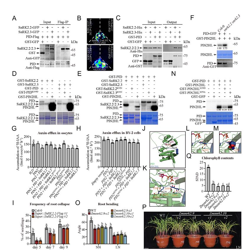 植物根系的向地性是其在长期进化中形成的关键适应能力—通过感知重力信号调整生长方向,深入土壤获取水分与养分,同时固定植株,这一过程的核心驱动力是生长素的极性运输,而PIN-FORMED(PIN)家族转运蛋白(尤其是 PIN2)是生长素运输的“关键载体”。长期以来,科学界已知激酶的磷酸化修饰能调控PIN 蛋白功能,但具体哪些激酶参与、如何通过精准调控实现植物对环境的适应性生长,始终是未被完全破解的科学谜题。此次两团队强强联合,通过多学科技术手段,最终揭开了SnRK2与PID激酶“对话”调控根向重力性的神秘面纱。