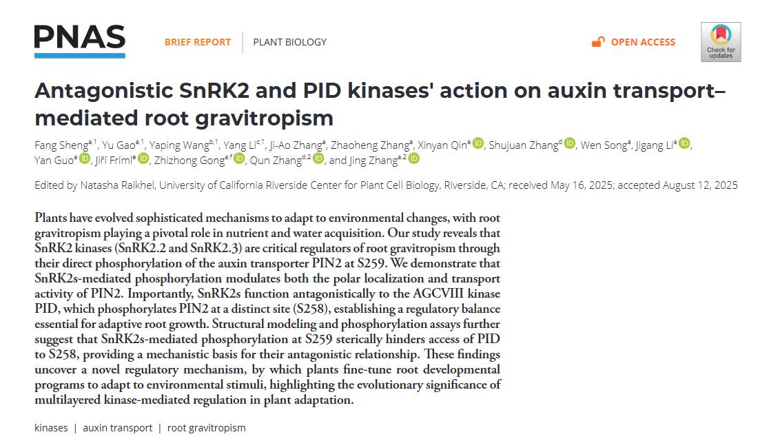 研究首次揭示 SnRK2 与 PID 两类激酶通过拮抗作用调控生长素转运蛋白 PIN2,进而精准控制植物根向重力性的分子机制。该发现为解析植物适应环境的 “生长-抗逆”平衡策略提供了全新视角,也为培育耐逆高产作物新品种提供了关键基因靶点与理论支撑。