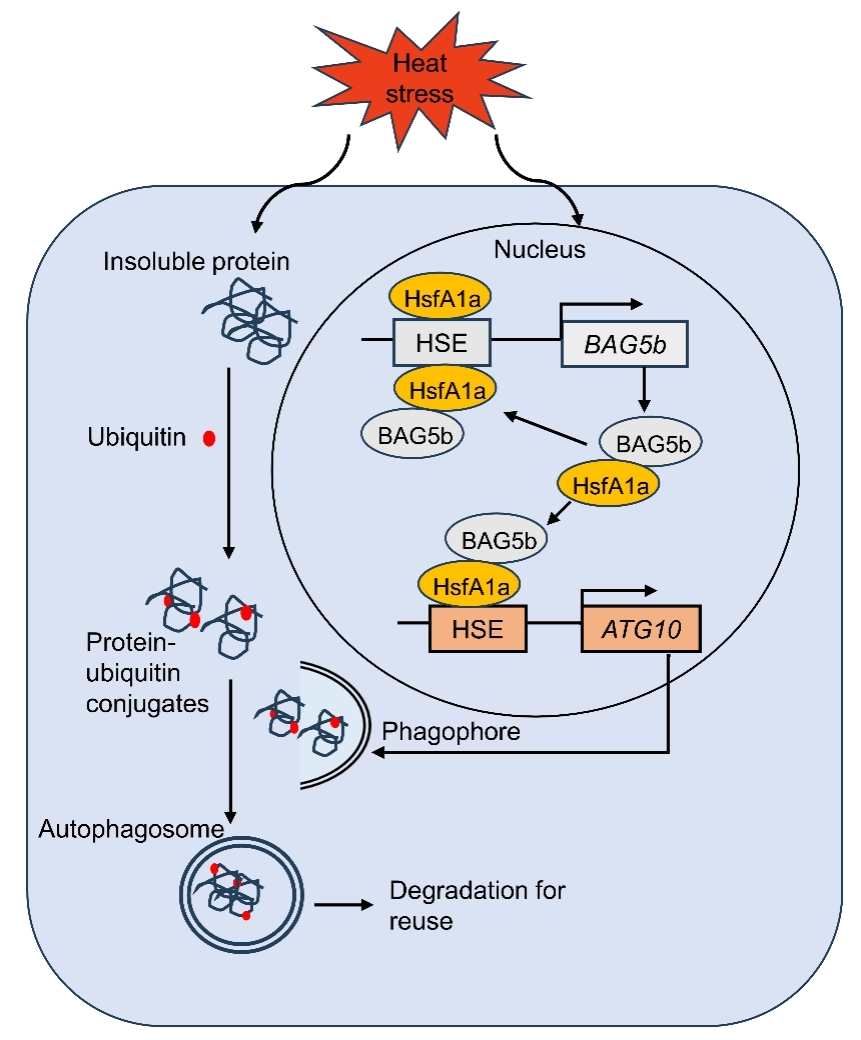 研究发现HsfA1a通过诱导自噬降解泛素化蛋白,增强番茄耐热性。HsfA1a直接结合BAG5b启动子以激活其表达,并与BAG5b蛋白互作。HsfA1a-BAG5b互作增强了HsfA1a介导的BAG5b及自噬相关基因(ATG10)的转录。BAG5b过表达植株增强耐热性,促进自噬体积累,而bag5b突变体对高温胁迫极为敏感,抑制自噬体形成。
