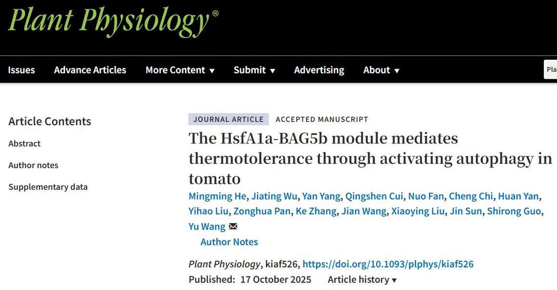 近日,ios版雷竞技官网园艺学院设施园艺团队在国际知名期刊PlantPhysiology在线发表题为“The HsfA1a-BAG5b module mediates thermotolerance through activating autophagy in tomato”的研究论文,揭示了HsfA1a–BAG5b模块调控自噬提高番茄(Solanum lycopersicum L.)耐热性的作用机制。