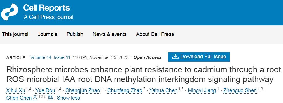 近日,ios版雷竞技官网生科院沈振国团队陈晨课题组在《Cell Reports 》期刊上发表了题为“Rhizosphere microbes enhance plant resistance to cadmium through a root ROS-microbial IAA-root DNA methylation interkingdom signaling pathway”的研究论文。该研究首次揭示了植物与根际促生菌通过“植物ROS-根际微生物IAA-宿主甲基化”跨界信号传导通路协同适应环境胁迫的机制。该研究为胁迫环境下植物-微生物互作提供新见解,同时为设计具有抗逆促生功能的合成菌群提供理论基础。