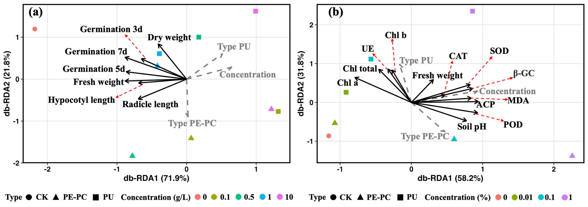 通过基于距离的冗余分析(distance-based redundancy analysis, db-RDA)揭示了MPs类型与浓度对植物生理特征与土壤酶活性的协同影响机制。MPs浓度是影响植物抗氧化反应与土壤代谢活性的关键因子,而MPs类型则在不同阶段表现出差异化效应。高浓度PU MPs与光合色素及根系代谢活性呈正相关,而PE-PC MPs与氧化酶活性和pH变化更为相关,显示其对土壤氧化还原过程具有更强干扰性。