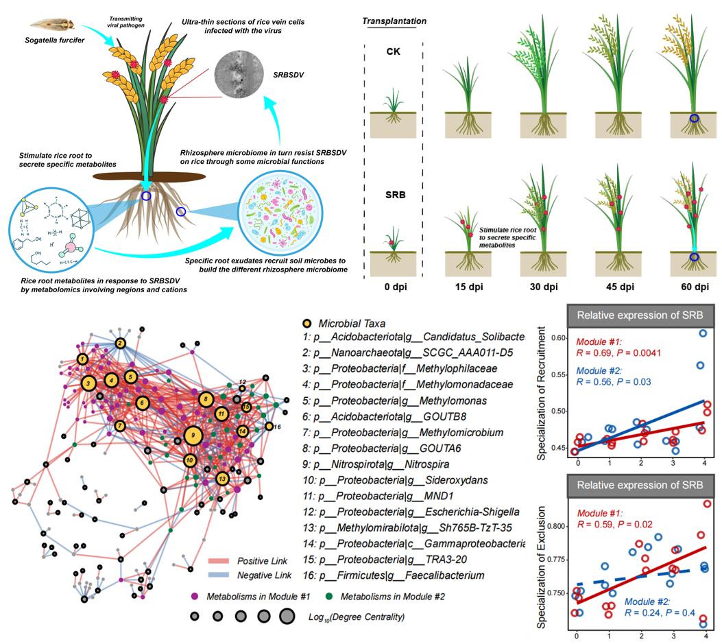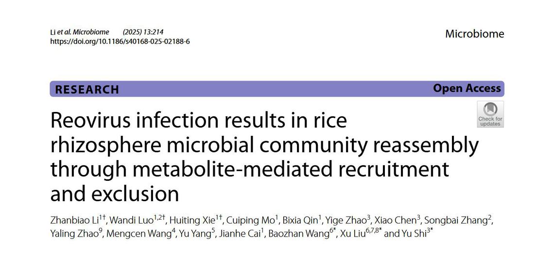 近日,ios版雷竞技官网生命科学学院王保战教授课题组联合河南大学、广西农科院等单位,在微生物学顶级期刊《Microbiome》发表题为“Reovirus infection results in rice rhizosphere microbial community reassembly through metabolite-mediated recruitment and exclusion”的研究论文。该研究揭示了虫媒病毒可通过调控植物根系代谢物组成,选择性招募或排斥关键微生物类群,从而重塑水稻根际微生物群落结构与功能,为通过微生物组调控提升作物健康提供了新思路。