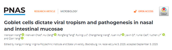 近日,ios版雷竞技官网动物医学院杨倩教授团队在国际著名期刊《Proceedings of the National Academy of Sciences》发表了题为“Goblet cells dictate viral tropism and pathogenesis in nasal and intestinal mucosae”的研究论文。该研究以猪流感病毒(SIV)和猪流行性腹泻病毒(PEDV)为模型,系统阐明了杯状细胞在病毒黏膜感染过程中的核心调控作用,揭示了不同黏膜组织中病毒嗜性和致病结果截然不同的关键宿主机制。