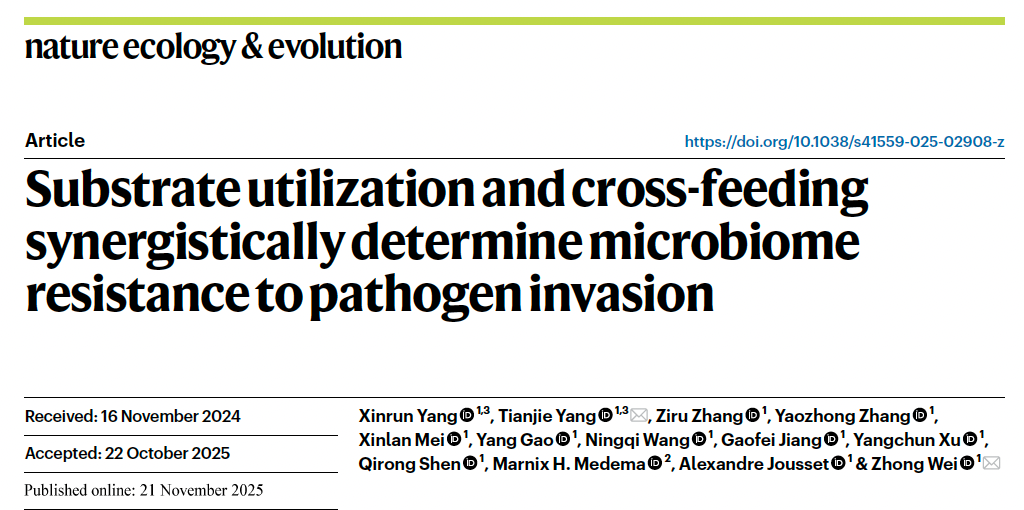 11月21日,国际权威期刊《Nature Ecology & Evolution》在线发表ios版雷竞技官网资源与环境科学学院沈其荣院士团队LorMe实验室的研究成果《Substrate utilization and cross-feeding synergistically determine microbiome resistance to pathogen invasion》。该研究针对复杂根际环境下病原菌入侵难预测,有益菌群-病原菌营养互作机制不清等科学难题,通过构建基因组代谢模型,成功实现对有益菌群抵御病原菌入侵能力的精准预测,并揭示外部营养竞争与内部代谢互惠协同驱动菌群抑病性的关键机制,为土壤生物障碍消减提供重要技术支撑与理论依据。