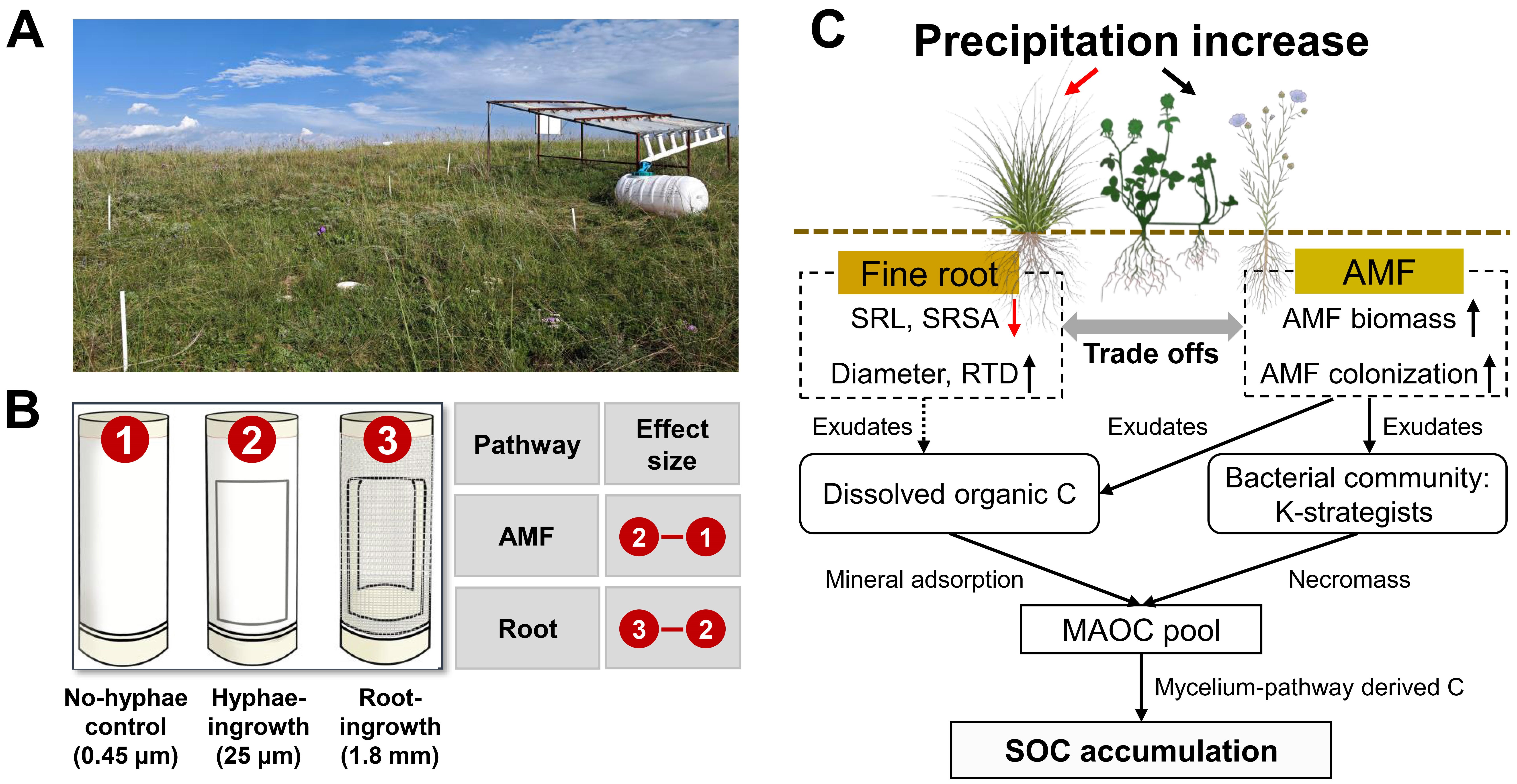 土壤有机碳储量的变化在调节未来气候变化中具有关键作用。植物根系和丛枝菌根真菌(Arbuscular Mycorrhizal Fungi, AMF)是调控土壤有机碳动态的核心生态因子。然而,未来气候变化(如降雨增加)如何影响根系-AMF介导的土壤有机碳形成与稳定机制仍缺乏系统研究。