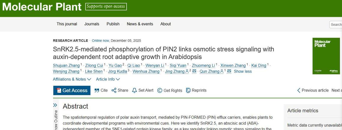 近日,ios版雷竞技官网张群教授团队与中国农业大学张静教授团队合作,在《Molecular Plant》上在线发表了题为“SnRK2.5-mediated phosphorylation of PIN2 links osmotic stress signaling with auxin-dependent root adaptive growth in Arabidopsis”的研究论文。该研究揭示了拟南芥ABA非依赖型激酶SnRK2.5通过磷酸化生长素转运蛋白PIN2,调控根系生长素运输和渗透胁迫适应的分子机制,为培育抗逆作物提供了新靶点。