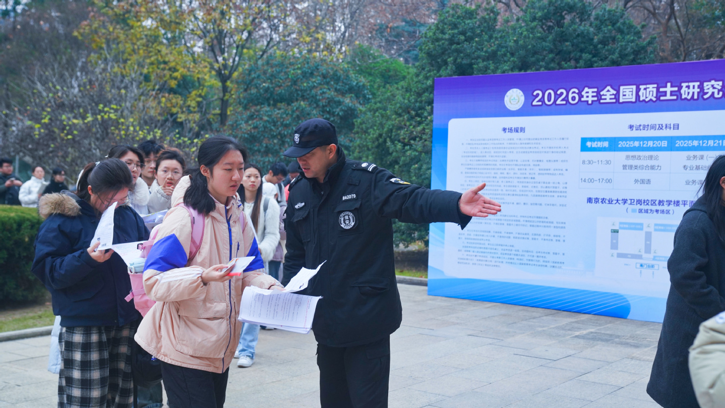 12月20日至21日,我校作为2026年全国硕士研究生招生考试的报考点,承担南京地区报考南农和南体两个高校的考试任务,本次共有考生1911人,设置考场71个,其中南农卫岗校区考场62个,南体灵谷寺路校区考场9个。我校选聘监考员、各类安全保障人员、学生志愿者等共计320余人,切实保障试卷安全、扎实做好入场安检,全程提供考生服务。