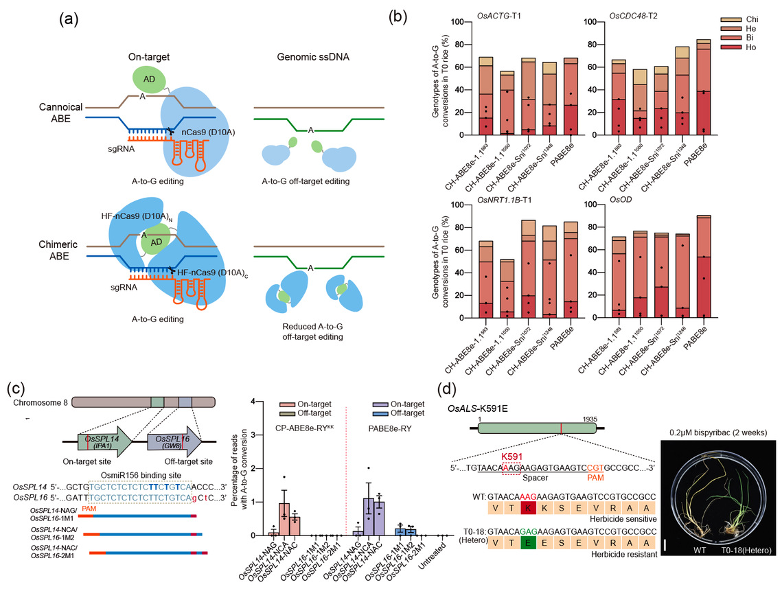 近日,ios版雷竞技官网万建民院士团队通过蛋白质工程设计,开发了一类高效、高特异性的“嵌合高保真Cas9蛋白”形式的腺嘌呤碱基编辑工具CH-ABE及其PAM-less变体,在水稻中实现了高效和高特异性兼具的精准单碱基编辑,该研究成果于2025年12月23日在线发表于植物学知名期刊Plant Biotechnology Journal上。