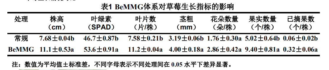 在盐城市亭湖区三位农场主的果园家庭农场,据南农大植保院课题组介绍,BeMMG体系的草莓种植过程中,使用微生物菌剂宁盾能够有效促进草莓健康生长、提高抗病抗逆能力,同时可以使用与宁盾兼容的其他环境友好型生物农药防治虫害。与常规的草莓相比,BeMMG的草莓植株无论是在株高、茎粗、叶绿素、还是在叶片数、花朵数和果实数上,都有显著的提高(表1)。并且在许多常规草莓果实尚未成熟的时候,BeMMG草莓已经开始采摘甚至长出新的枝丫了(图1)。而在口感方面,BeMMG体系的草莓也更酸甜可口,令人欲罢不能。