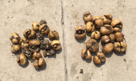 会议第二环节为浙贝母田间采收现场直播,由江苏省南通市海安东城浙贝母合作社的叶海军老师主持,叶海军带领参会人员于田间分别对BeMMG及常规体系地块进行随机采挖,常规体系所采鳞茎根腐病及软腐病高发,几乎每采收五枚浙贝母就有一枚发病,且病情严重。对比BeMMG体系,直播期间只发现了一枚生病鳞茎,采挖统计结果表现出BeMMG体系对软腐病比前期发现的对根腐病的防效更高。同时,田间采挖结果对比发现BeMMG体系的浙贝母鳞茎平均大小明显比常规体系更大,且鳞茎饱满光色,色泽品质更佳。郭坚华团队同时对当地土壤及样品进行取样,以进行进一步检测。