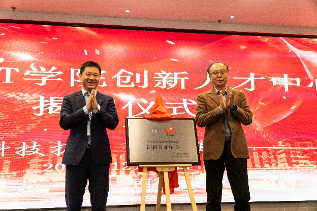 沈毅和陈巧敏为中心揭牌,丁艳锋和华为校企合作总监闫建刚为ICT学院创新人才中心揭牌。人工智能学院沈明霞教授与温氏股份信息中心副总工程师周军波代表校企双方签订战略合作协议。人工智能学院党委副书记卢伟与华为江苏政企教育行业总经理张天宇代表校企双方签订ICT学院创新人才中心共建协议。