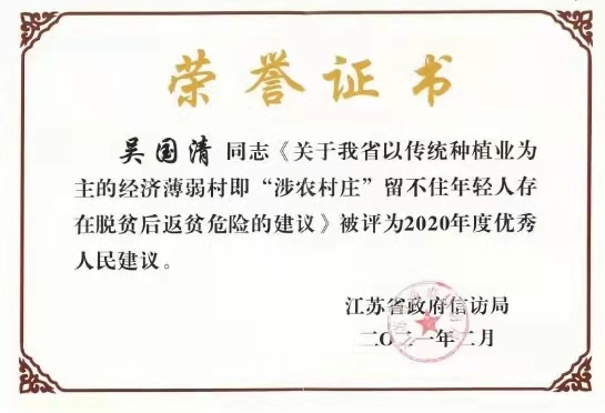 近日,马克思主义学院吴国清教授《关于我省以传统种植业为主的经济薄弱村即“涉农村庄”留不住年轻人存在脱贫后返贫危险的建议》被江苏省政府信访局评为“2020年度优秀人民建议”。