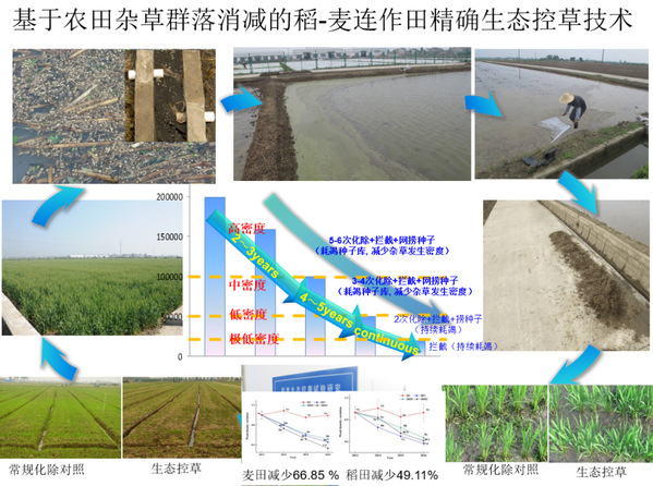 “稻田杂草群落消减控草技术”基于“断源”、“截流”、“竭库”生态学理念,针对杂草群落综合体,通过减少种子库的输入量,降低直至耗竭种子库,洁净土壤,就可以减轻或免除草害。主要技术抓手是针对杂草种子适应长期的水稻种植灌水管理的环境而随水流传播的特点,应用灌溉期进水口拦网截流及蓄水期漂浮草籽捞除技术,阻断外源杂草种子的传入及减少种子的回馈,加快种子库的耗竭,配合化学除草剂减量应用,达到标本兼治。