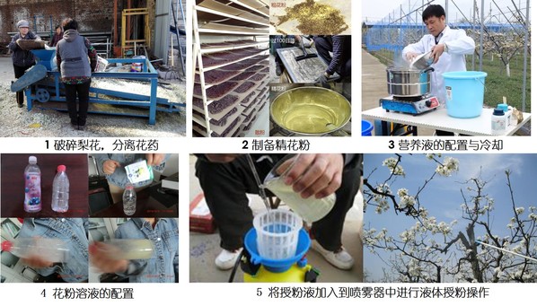 “梨树液体授粉节本增效技术”针对梨树自然传粉和昆虫授粉易受天气影响、人工授粉可操作时间短、费时费工等产业问题,基于梨生殖生理与细胞生物学研究,研发出一种适于梨树液体授粉的营养液配方,解决了常规果树液体授粉中花粉活力下降快、分散不均匀等诸多实际问题。于梨树初花60%时通过喷雾器进行授粉,在保障果实品质和产量的基础上,可将梨树授粉时间从人工点授18小时/亩降低到0.5小时/亩,花粉用量也节约了1/2~2/3,若搭载无人机可将授粉时间进一步降低到1分钟/亩,极大地提高了授粉效率、促进节本增效。