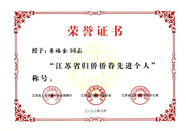 日前,江苏省人力资源和社会保障厅、省归国华侨联合会、省人民政府侨务办公室联合发文(苏人社发〔2022〕111号)表彰了 “江苏省归侨侨眷先进个人”。