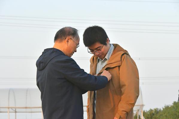 在田埂上,老党员代表陈效民为新发展党员代表佩戴党徽。一枚枚党徽成为了新老党员的传承的“精神接力”。