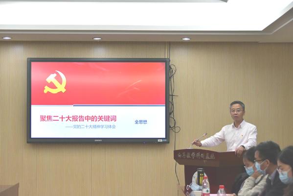 学院党委书记全思懋作了题为“聚焦二十大报告中的关键词——党的二十大精神学习体会”的领学报告。他表示,学习党的二十大精神要结合当前我国高等教育和学校、学院的发展实际,把握高校作为科技、人才、创新“三个第一”的交汇点这一最大实际,深入理解“教育、科技、人才是全面建设社会主义现代化国家的基础性、战略性支撑”的深刻含义,主动适应当前高等教育的新理念,新格局和高质量发展要求,扎根中国大地、落实立德树人,着力培养符合中国式农业现代化发展要求的新型创新人才。