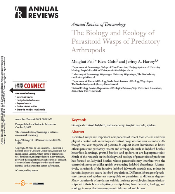 近日,我校植物保护学院害虫生物防治实验室费明慧副教授,在昆虫学领域国际顶尖学术期刊Annual Review of Entomology在线发表了题为“The Biology and Ecology of Parasitoid Wasps of Predatory Arthropods(捕食性节肢动物的天敌寄生蜂的生物学及生态学研究)”的综述文章。
