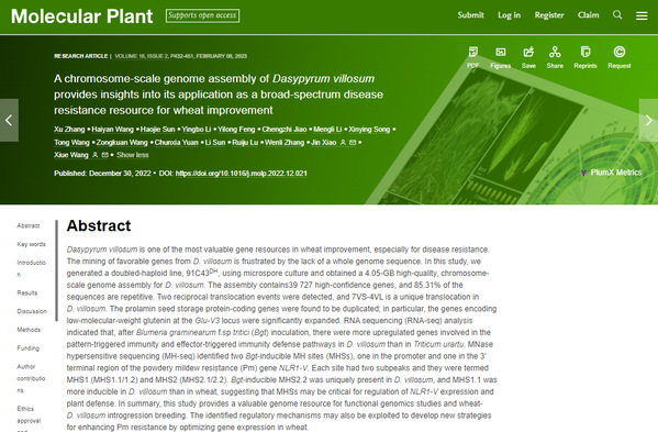 2月6日,ios版雷竞技官网农学院细胞遗传研究所作物遗传与种质创新国家重点实验室小麦遗传育种创新团队在《Molecular Plant》杂志上发表了题为“A chromosome-scale genome assembly of Dasypyrum villosum provides insights into its application as a broad-spectrum disease resistance resource for wheat improvement”的研究论文。该研究以来自英国剑桥植物园的簇毛麦品系91C43为材料,通过小孢子培养和染色体加倍技术创制了簇毛麦双单倍体91C43DH,利用三代测序辅以二代测序、BioNano和Hi-C技术,组装出了该物种染色体水平的高质量基因组序列,揭示了簇毛麦基因组的结构特征和进化地位,阐明了抗白粉病重要性状形成的分子机制,为小麦遗传改良和广谱抗病性研究提供重要遗传资源。