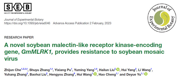 近日,农学院国家大豆改良中心喻德跃教授课题组在《Journal of Experimental Botany》期刊发表了题为“A novel soybean malectin-like receptor kinase-encoding gene, GmMLRK1, provides resistance to soybean mosaic virus”的研究论文。