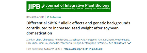 盖钧镒院士团队前期率先构建了1套野生大豆染色体片段代换系群体,定位了大豆百粒重、油脂含量等驯化相关性状的遗传位点。本研究针对控制大豆百粒重的主效位点qSW16.1,通过精细定位克隆到该QTL内的SW16.1基因,在大豆种质资源中鉴定到12种SW16.1等位基因。转录组、酵母单杂、启动子-荧光素酶等分析表明,SW16.1序列变异(ployQ中Q数目不同)可调控大豆籽粒中MT4的表达量,从而影响百粒重。此外,研究分析了大豆种质资源群体中SW16.1和其它已知粒重基因的自然变异,发现栽培大豆丢失了38.5%的野生大豆等位基因,并且丢失的等位基因多数对百粒重是负效的。负效等位基因的丢失导致栽培大豆中正效等位基因的频率变高,伴随着遗传背景的改变,促成野生大豆驯化为栽培大豆后百粒重增加。该研究结果为解析大豆优异种质资源的形成与演化提供了新的见解,为大豆设计育种提供理论依据。