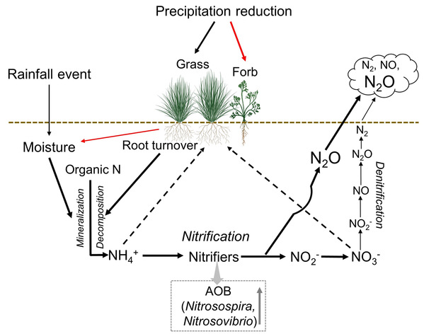 氧化亚氮(N2O)是一种强效温室气体,其全球增温潜势是二氧化碳(CO2)的300倍左右,对平流层臭氧具有强破坏性。在自然生态系统中,半干旱草地是非常重要的N2O排放源。气候变化,改变降水格局, 导致半干旱地区更加频繁的干湿交替,显著影响陆地生态系统土壤氮循环过程,进而调控土壤N2O排放。然而,降水减少和土壤干湿交替如何影响半干旱草地氮循环微生物和N2O 排放尚不清楚。