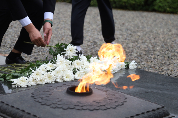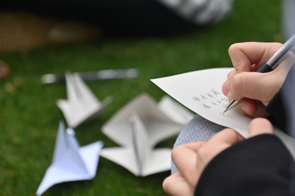 共建仪式结束后,师生一同参观了《南京大屠杀史实展》,在祭场举行悼念仪式,默哀并敬献菊花,同学们还献上了亲手折好的100枚千纸鹤,表达了大家祈求和平的美好心愿。