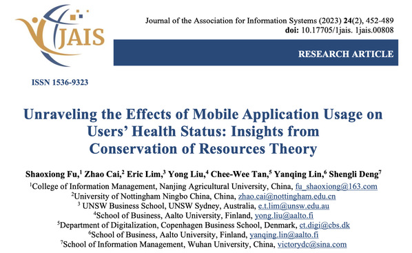 近日,信息管理学院付少雄副教授在信息系统领域顶级期刊国际信息系统学会会刊Journal of the Association for Information Systems(JAIS)发表论文“Unraveling the Effects of Mobile Application Usage on Users’ Health Status: Insights from Conservation of Resources Theory”,该文章探讨了移动APP使用模式与用户健康间的影响机理。JAIS在《FMS管理科学高质量期刊推荐列表》(FMS A)、Academic Journal Guide(AJG/ABS4*)、Journal Citation Reports(JCR Q1)等国内外权威期刊列表中均位列最高等级。