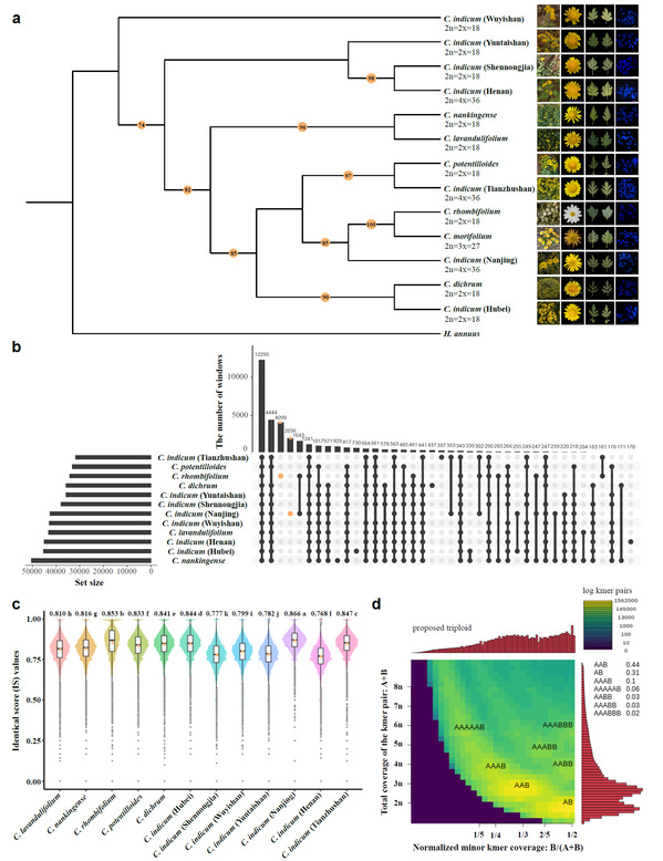 为了探寻栽培菊花的潜在供体植物及其基因组构成,我们对分布在中国的12个菊属野生种进行了重测序。系统进化树、特异性序列、identity score(IS)和渐渗分析结果表明菱叶菊(Chrysanthemum rhombifolium)和南京野菊(Chrysanthemum indicumNanjing)对于栽培菊花基因组的贡献最大。进一步通过染色体特异性短片段、Smudgeplot及荧光原位杂交(FISH)实验,并结合前期研究证据表明菊花基因组主体为“AA′B”结构(图3),包含大量菊属野生种基因组片段渐渗的节段异源多倍体(segmental allopolyploid)。