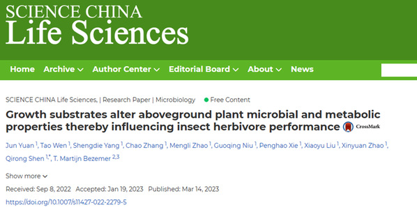 不同栽培系统会改变植物组织养分或者次级代谢产物的产生,从而影响下一营养级如昆虫的取食。然而,地下部生长基质对于地上部植物-昆虫相互作用的影响及其潜在机制尚不清楚。近日,SCIENCE CHINA Life Sciences在线发表了沈其荣院士团队的研究成果:Growth substrates alter aboveground plant microbial and metabolic properties thereby influencing insect herbivore performance。该研究发现了叶片和昆虫中微生物群落的连通性,阐明了作物叶片营养物质和代谢物对昆虫取食的作用,解析了栽培方式通过“土壤-植物”系统影响植食者肠道微生物组成及取食偏好的机理。