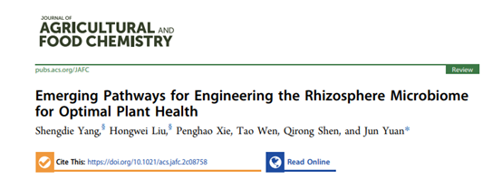 全球气候变化对作物产量的影响越来越大,对全球粮食安全构成重大威胁。根际微生物群落与植物互作密切,可通过多种机制促进植物的生长和提高抗逆性。近日,Journal of Agricultural and Food Chemistry以Supplementary Cover的形式在线发表了沈其荣院士团队的综述论文:Emerging pathways for engineering the rhizosphere microbiome for optimal plant health。该文综述了调控根际微生物组来提高作物生产力的方法,重点介绍了合成菌群、宿主介导的微生物组工程、选择特定植物根分泌物作为益生元和培育与微生物有益互作的作物品种等调控手段。