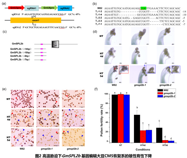 大豆是重要的蛋白和油料作物,杂种优势利用是实现作物产量突破的重要途径,细胞质雄性不育/恢复(Cytoplasmic-male sterility/restorer-of-fertility, CMS/Rf)系统是作物杂种优势利用的最广泛体系之一,在水稻、玉米、油菜等作物上已取得巨大成功,大豆杂种优势利用也有望成为实现大豆产量突破的重要途径。尽管大豆杂种优势利用研究起步较晚,但经过我国科研人员30余年的系统研发已取得较大进展,截至2021年,我国育成并通过审定的杂交大豆品种有39个,并在生产上进行了示范、推广和应用。然而,部分大豆三系杂种F1组合的雄性育性稳定性易受高温等环境因子的影响而导致出现结实少甚至不结实的现象,成为大豆三系杂交种大面积推广应用的潜在风险。杨守萍教授团队前期研究发现大豆CMS恢复系的恢复力强弱决定了高温胁迫下大豆三系杂种F1的雄性育性稳定性。随后开展了高温胁迫下大豆雄性育性调控基因的挖掘和鉴定研究,发现大豆miR156b及其靶基因GmSPL2b在大豆三系杂种F1开花期响应高温胁迫,高温处理后miR156b过表达转基因拟南芥表现雄性不育,推测miR156b-GmSPL2b是调控高温胁迫下大豆三系杂种F1雄性育性的分子调控网络中关键模块之一。但是,miR156b-GmSPL2b参与调控高温胁迫下大豆CMS恢复系雄性育性的具体分子机理尚不清楚。