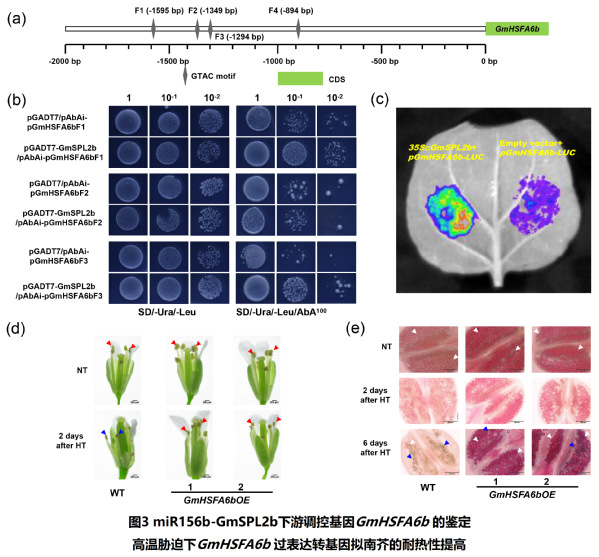 为此,本研究在前期研究基础上,通过转基因大豆功能研究发现,开花期高温胁迫下miR156b过表达转基因大豆CMS恢复系及其与不育系NJCMS1A的杂种F1均表现雄性不育。利用CRISPR/Cas9技术成功敲除大豆CMS恢复系W82中miR156b的靶基因GmSPL2b,发现高温胁迫下GmSPL2b基因编辑大豆的雄性育性下降。进一步利用转录组学、生物信息学、酵母单杂交和双荧光素酶测定等实验鉴定出miR156b-GmSPL2b模块的下游调控基因热激转录因子GmHSFA6b。转基因拟南芥功能研究发现,开花期高温胁迫下GmHSFA6b过表达转基因拟南芥的耐热性提高。转录组和代谢组测序、生理生化指标测定发现,miR156b-GmSPL2b模块通过类黄酮和活性氧代谢途径参与调控高温胁迫下大豆CMS恢复系的雄性育性。该研究为创制大豆耐高温强恢复系和培育雄性育性稳定的优良杂交大豆新品种提供了基因资源和理论依据。