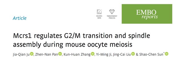 3月23日,ios版雷竞技官网动物科技学院孙少琛课题组在EMBO Reports上在线发表题为Mcrs1 regulates G2/M transition and spindle assembly during mouse oocyte meiosis的研究论文,并被选为当期封面文章。该研究解析了转录因子Mcrs1在卵母细胞成熟过程对减数分裂恢复(G2/M转换)以及纺锤体组装的重要功能。