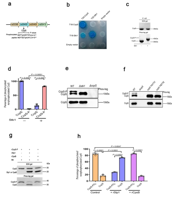 本研究发现猪链球菌丝氨酸苏氨酸激酶Stk1能够特异性地磷酸化修饰底物蛋白CcpS,且CcpS的磷酸化修饰仅发生在特异的氨基酸残基Thr4和Thr7,而Stk1相关磷酸酶Stp1能够可逆去除CcpS-P的磷酸化修饰(图1)。随后的研究表明CcpS的磷酸化修饰是活跃的,其广泛地参与猪链球菌的抗各类应激反应过程。进一步探究CcpS的生物学功能,发现Stk1-CcpS系统能够调控猪链球菌CPS合成,并介导细菌的抗巨噬细胞吞噬作用。
