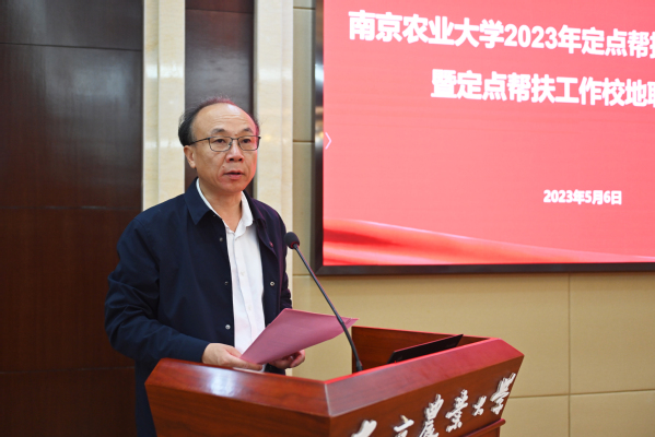 王春春对学校定点帮扶贵州省麻江县11年来的工作进行了回顾,对校地双方党政干部和广大师生群众辛勤的付出表示感谢。王春春指出,2023年是贯彻落实党的二十大精神的开局之年,是“十四五”规划承上启下的关键之年,也是学校建设农业特色世界一流大学的提速之年,全校要上下同心,共同担负起国家赋予学校的政治责任,全面推进定点帮扶和乡村振兴工作。王春春强调,要着力提高政治站位,不折不扣贯彻落实好党中央决策部署,要持续聚焦农业强国,铆足干劲推动农业强国建设开好局起好步,要切实强化责任落实,对标对表高质量完成2023年度定点帮扶目标任务。王春春号召全体师生,要在定点帮扶和乡村振兴的大舞台上,贡献“南农智慧”与“南农力量”。