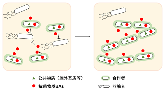 如同人类社会一样,微生物群体内部具有明确而细致的劳动分工,不同的细胞亚群负责执行不同的任务且彼此相互合作。产生并共享“公共物品(public goods)”是微生物维持群体稳定的关键因素,但是微生物群体中会出现不产生但只利用群体“公共物品”的“欺骗者(cheater)”,不劳而获的“欺骗者”由于不需要额外耗能生产“公共物品”而在群体中具有生长优势,如果“欺骗者”逐渐增多,将导致群体崩溃。所以,微生物群体发展出惩罚“欺骗者”的机制以维护群体稳定。