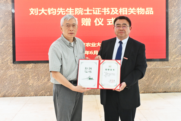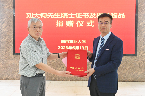 捐赠仪式上,刘光宇向陈发棣捐赠刘大钧先生的院士证书。图书馆馆长郭忠兴代表学校职能部门接收刘大钧先生的其他物品捐赠。董维春向刘大钧先生家属颁发《捐赠证书》。