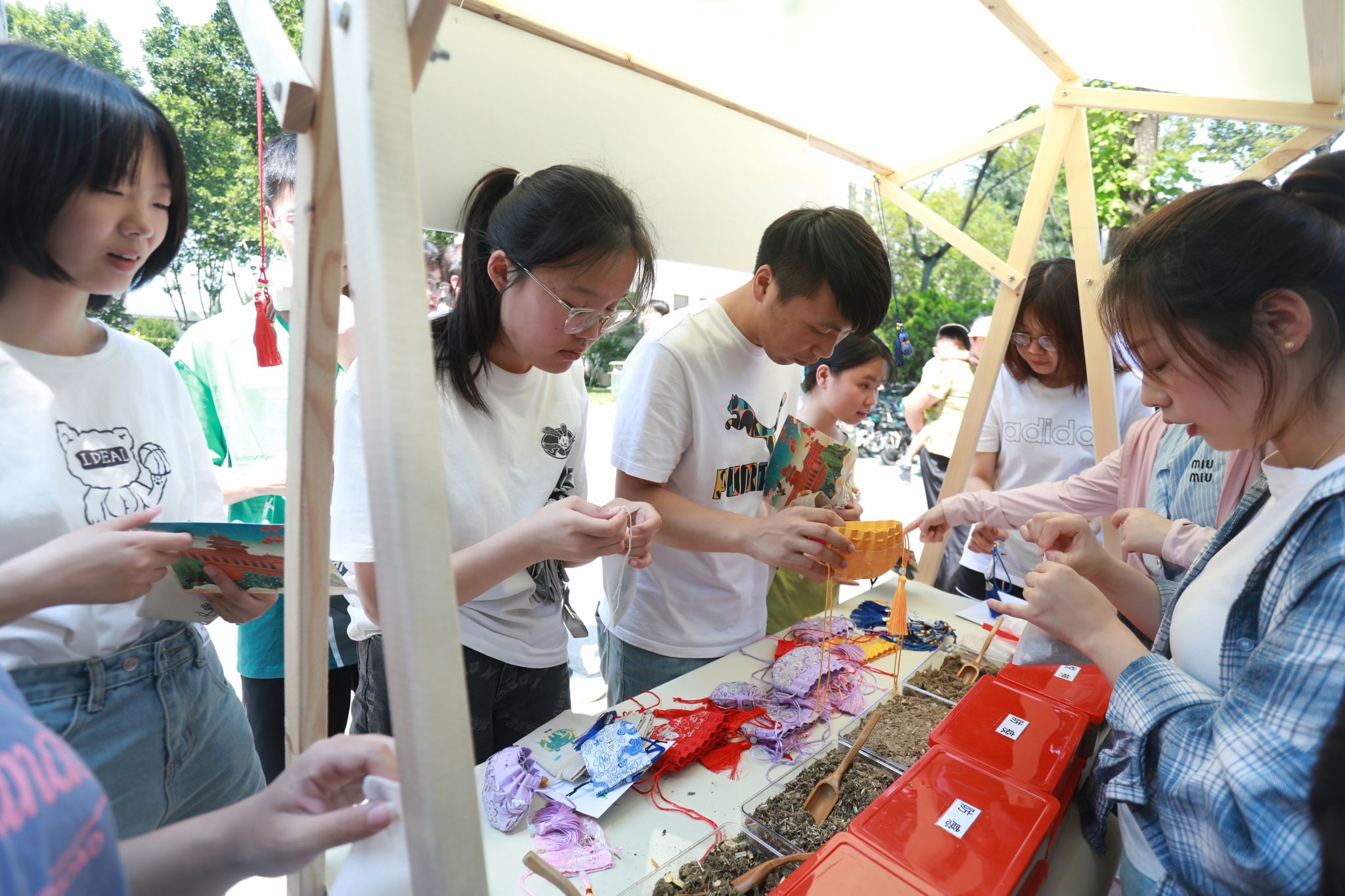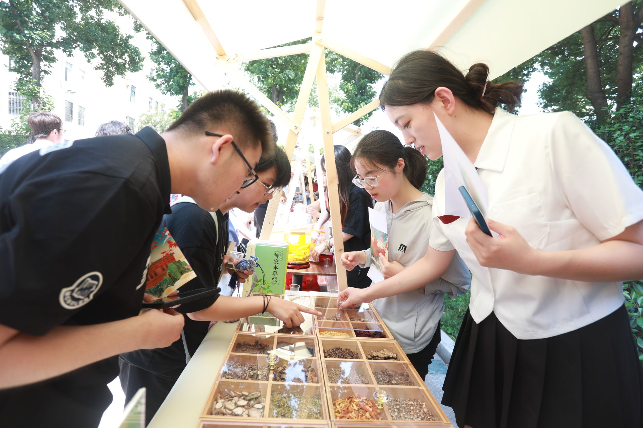 活动现场,南京市中西医结合医院与ios版雷竞技官网校医院14个科室的近30位医护专家为学校师生进行了大型专家义诊,累计提供健康服务300多人次,发放文创中药香囊千余个。在“神农本草”中医药文化展示区,人头攒动,中药香囊、药用植物、芳香中药、中药传统制药工具、中药文创作品、中药特色产品、中药标本、中药学科特色及中医药文化展等一系列互动展区吸引了师生。