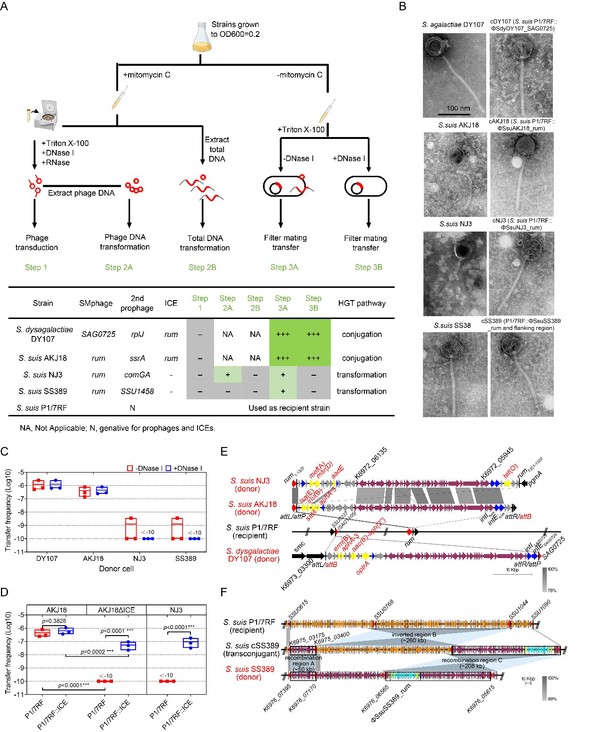该研究采用噬菌体-耐药基因双向鉴定策略系统分析了数据库中10,983个和临床分离的736个链球菌基因组中的前噬菌体和耐药基因,鉴定了一类可直接编码ARGs的前噬菌体家族(SMphages)。SMphages分布于包括猪链球菌和无乳链球菌在内的21种链球菌种属中,携带包括万古霉素耐药基因簇vanG和噁唑烷酮类耐药基因optrA在内的10大类25种耐药基因,Tanglegram分析提示SMphages存在广泛的种内和中间水平转移现象。但是链球菌中噬菌体的转导和溶源化效率低且宿主谱窄,传统的转导水平转移途径不足以解释SMphages在链球菌中的广泛分布。因此推测尚存在未被鉴定的转移机制介导前噬菌体在链球菌属间的水平转移。为验证该假设,研究人员设计了一组试验来鉴定SMphages的水平转移途径以及其它可移动元件在其转移过程中的作用。试验选取了4株携带SMphages的链球菌,包括2株ICE-negative猪链球菌,1株ICE-positive猪链球菌和1株ICE-positive停乳链球菌,研究发现SMphages通过转导和转化途径进行转移的作用非常有限,而是可通过高频率的接合途径进行水平转移。研究进一步通过构建ICE敲除和回补株,证实ICE无论存在于供体菌还是受体菌,均可动员SMpahges的通过接合方式进行高频率水平转移,转移至受体菌后,又可通过位点特异性重组和同源重组的方式整合到宿主菌染色体上。前噬菌体借助ICE进行接合转移新途径的发现,为研究不同可移动遗传元件相互作用机制奠定理论基础,同时,也提出警示前噬菌体作为ARGs的储库和转移载体,其引起的ARGs扩散风险也是不容忽视的。