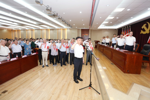 校党委书记王春春为“光荣在党50年”老党员颁发纪念章,新发展党员代表为老党员献花。王春春领誓,全体与会新发展党员面向党旗进行入党宣誓,老党员重温了入党誓词。